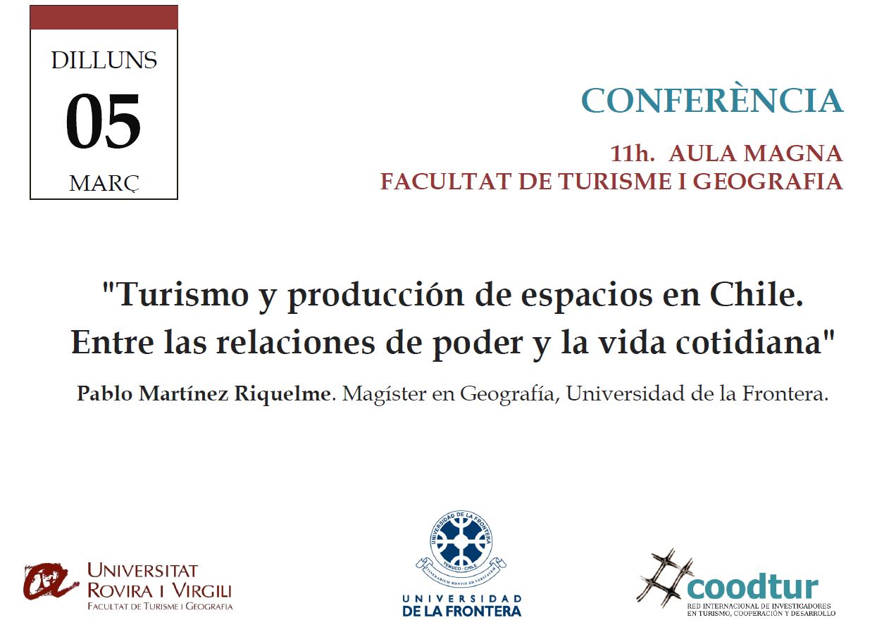 El próximo día 5 de Marzo, a las 11 horas en el aula Magna de la Facultad de Turismo y Geografía, continúa el ciclo de conferencias GEOTOURVTalks con la charla titulada “Turismo y producción de espacios en Chile. Entre las relacionas de poder y la vida cotidiana”, a cargo de Pablo Martínez Riquelme, Magíster en Geografía de la Universidad de la Frontera.