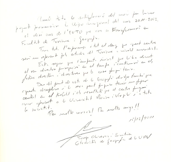 La lliçó inaugural "De la geografía al turisme" va anar a càrrec del Dr. Josep Oliveras Samitier, catedràtic d'Anàlisi Geogràfica Regional de la Universitat Rovira i Virgili.
