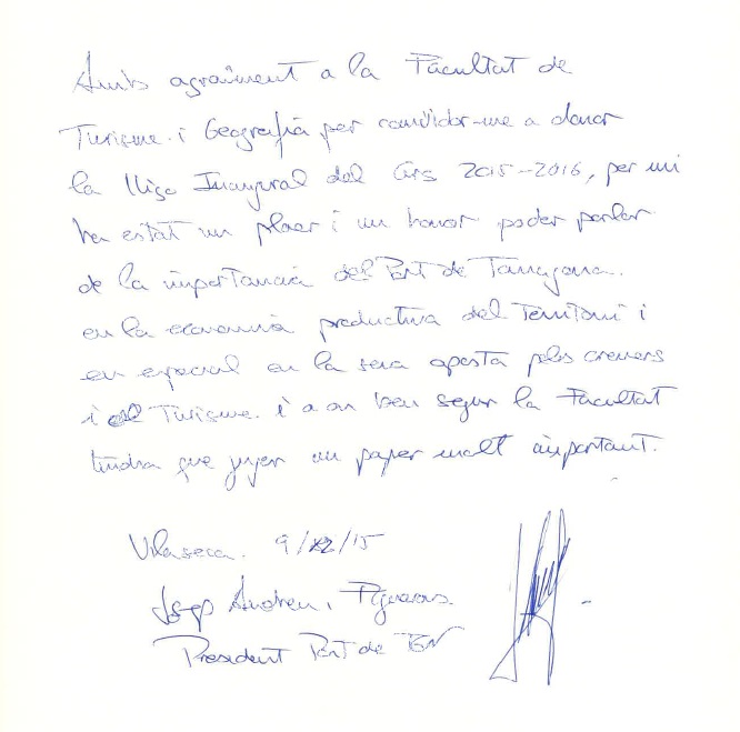 La lliçó inaugural "El Port, una eina per al desenvolupament econòmic i turístic del Camp de Tarragona" va anar a càrrec del Sr. Josep Andreu i Figueras, president de l'Autoritat Portuària de Tarragona.